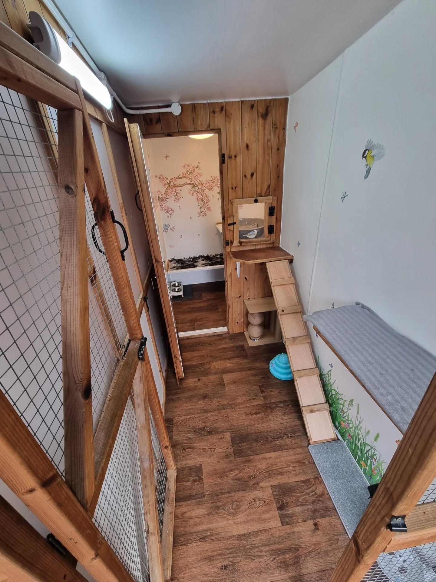 Within the lodge, each chalet benefits from solid partitions between exercise areas, giving cats extra privacy and reducing visual stress. Additional bedding, scratching posts, toys and a water fountain are all provided as standard — ensuring a comfortable, enriched and relaxing stay from the moment your cat arrives.